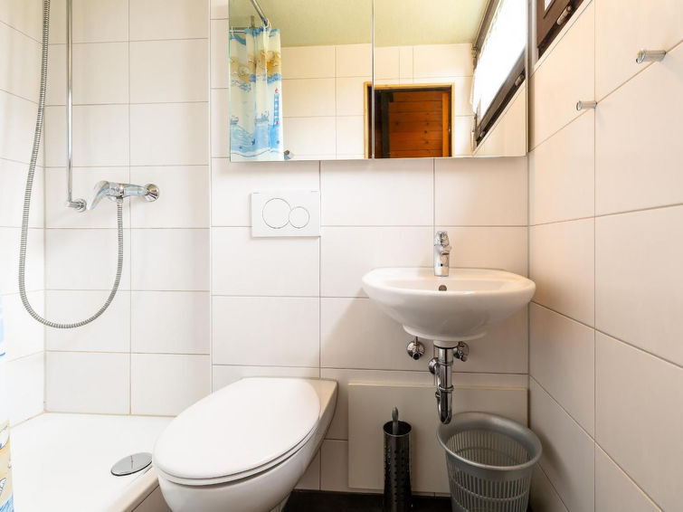 3-Zimmer-Haus 50 m2 auf 2 Stockwerken, im Erdgeschoss. Abgeschrägt: Wohn-/Esszimmer mit Sat-TV und Radio. Ausgang zum Garten, zur Terrasse. Abgeschrägte, offene Küche (2 Kochplatten, elektrische Kaffeemaschine). Dusche/WC. Dachgeschoss: (steile Treppe) 2 abgeschrägte Zimmer, jedes Zimmer mit 2 Betten. E-Heizung. Terrassenmöbel. Zur Verfügung: Internet (Wireless LAN, gratis). Bitte beachten: Nichtraucher-Haus. Maximal 1 kleines Haustier/Hund erlaubt. Nurdachhaus in Holzbauweise.