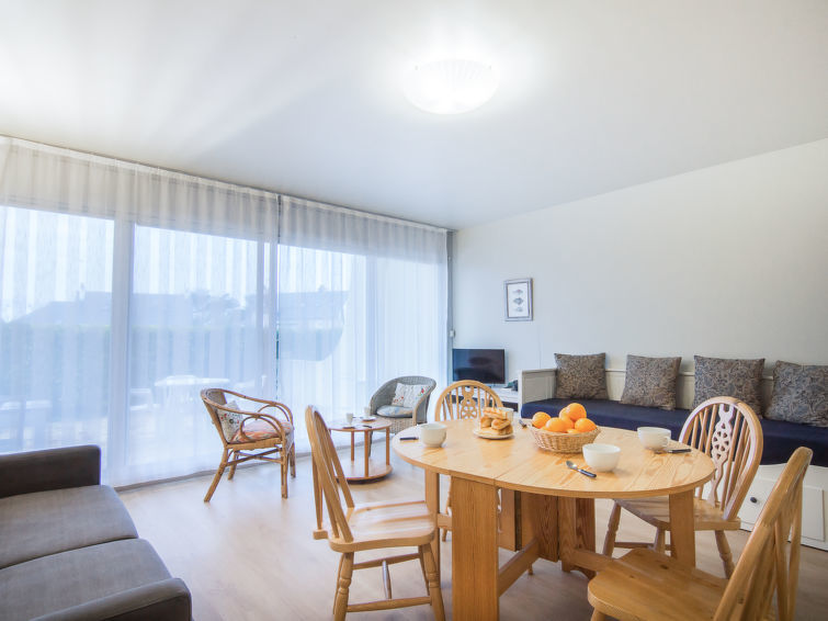 Studio 1-kamer 35 m2, op de begane grond. Comfortabel en mooi ingericht: woon-/eetkamer met 1 2-pers divanbed (1 x 140 cm, lengte 190 cm), TV. Uitgang naar het terras. Keuken (oven, afwasmachine, 3 keramische glas kookplaten, magnetron) met doorgeefluik. Douche, aparte WC. Gas-verwarming. Groot terras 24 m2. Terrasmeubelen. Ter beschikking: wasmachine, strijkijzer. Internet (WiFi, extra). Parkeerplaats nr. 9. Rookmelders. 56186 000641 7D