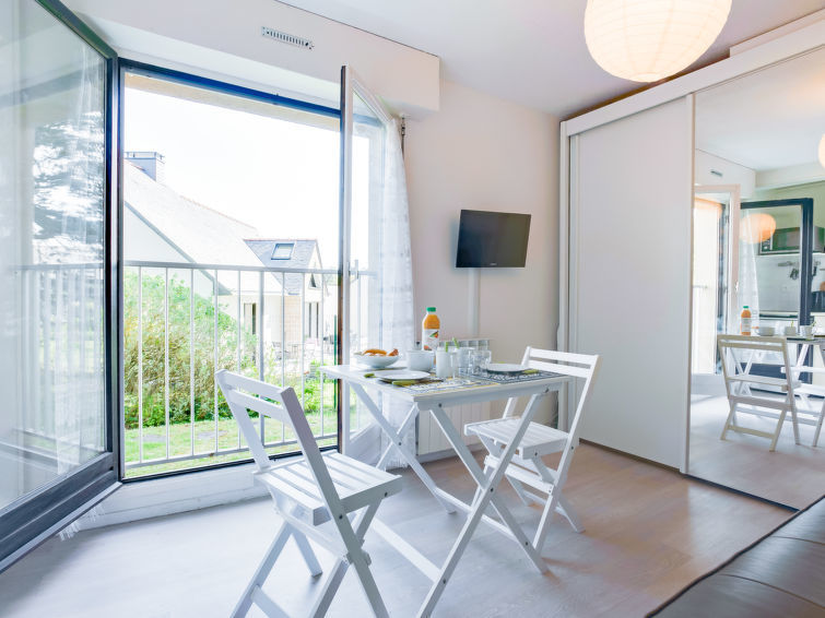 Flatgebouw "Rose des Vents". In de plaats, 1.5 km van het centrum, 500 m van zee, op het zuidoosten. Openbare parkeerplaatsen in de straat. Levensmiddelenwinkel 1.5 km, restaurant 1.5 km, bushalte 300 m, treinstation 1.5 km, thermaalbad "thalasso" 200 m. Jachthaven 1.8 km, golfterrein (9 holes) 1 km, tennis 100 m. Attracties in de buurt: Alignements de Carnac 21 km, La Trinité-sur-Mer 30 km, Vannes 47 km. De sleuteloverdracht vindt plaats bij het agentschap Interhome in Quiberon, 1 km.