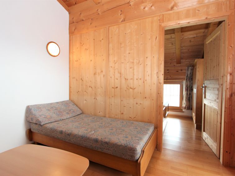 Appartement 4-kamers 86 m2, op de bovenste verdieping. Smaakvol en gezellig ingericht: hal. 1 kamer met 1 bed en 1 2-pers bed (140 cm). 2 2-pers. kamers. Woonkamer met Sat-TV (Flatscreen TV). Uitgang naar het balkon. Open keuken (oven, afwasmachine, 4 keramische glas kookplaten) met eethoek. Uitgang naar het balkon. Bad/WC. Balkon. Mooi panoramazicht op de bergen, het dal en het landschap. Ter beschikking: Internet (Internet (WiFi), extra). Rookmelders.