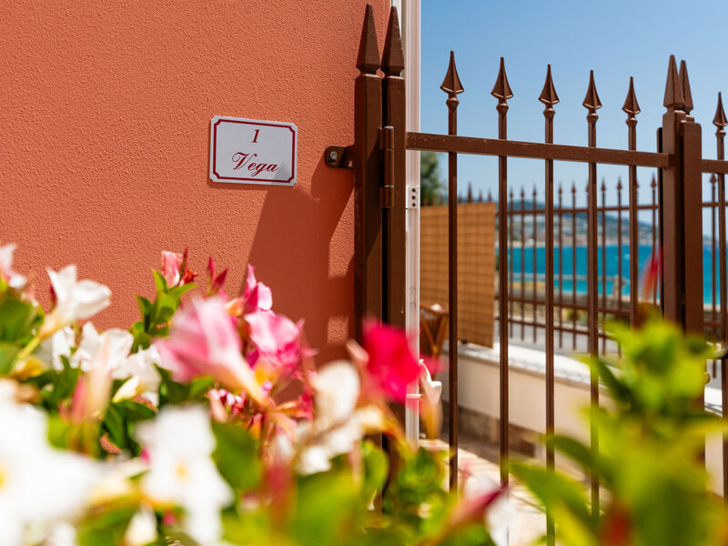"Vega", appartement 3-kamers 100 m2, op de begane grond. Comfortabel en smaakvol ingericht: woon-/eetkamer. Uitgang naar de tuin. 1 kamer met 2 bedden en douche/bidet/WC. 1 2-pers. kamer met 1 2-pers bed (160 cm, lengte 200 cm). Open keuken (oven, 4 kookpitten (vlammen), broodrooster, waterkoker). Uitgang naar de tuin, naar het terras. Douche/bidet/WC. Gas-verwarming. Verwarming alleen beschikbaar van 01.11. tot 15.04. Terras, kleine tuin. Terrasmeubelen. Zeer mooi panoramazicht op zee. Ter beschikking: wasmachine, klamboe. Internet (Internet (WiFi), gratis). Privé ingang.